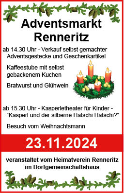 Wie auch schon in den vergangenen Jahren wird der Adventsmarkt im und am Renneritzer Dorfgemeinschaftshaus stattfinden. Organisiert von der Frauensportgruppe des Heimatvereins wird es neben liebevoll gestalteten Adventsgestecken und anderer Weihnachtsdeko auch das Kasperletheater für die kleinen Besucher geben. Ab 15.30 Uhr heißt es Vorhang auf für "Kasperl und der silberne Hatschi Hatschi".