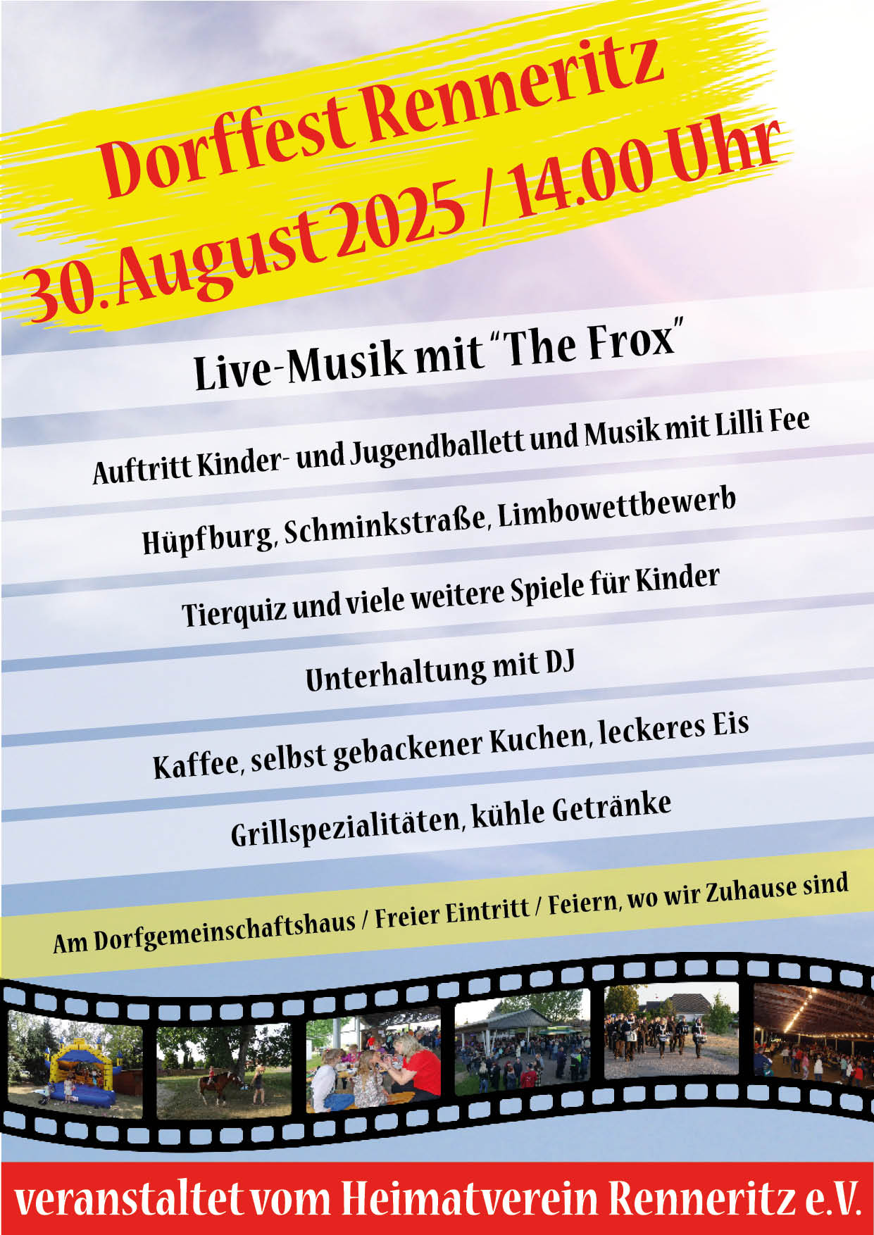 Kinderspiele, Live-Musik, leckeres Eis, Auftritt des Kinder- und Jugendballetts, Vorstellung der Feuerwehr und vieles mehr - all das gibt es zum Renneritzer Dorffest am 30. August. Die Mitglieder des Heimatvereins laden ab 14.00 Uhr kleine und große Kinder sowie Erwachsene an das Dorfgemeinschaftshaus ein, um gemeinsam einen tollen Nachmittag und einen schönen Abend mit Live-Musik zu verbringen. Mit selbst gebackenem Kuchen, Kaffee, leckeren Speisen vom Grill und kühlen Getränken gibt es rund um die Uhr das Passende zur Stärkung und Erfrischung. Wir freuen uns auf die Gäste und ein schönes gemeinsames Fest.